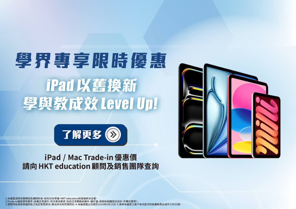 To enhance the learning experience, HKT education is launching an exclusive, limited-time trade-in upgrade program for students. Exchange your current devices for your desired iPad model, making it easy to upgrade your iPad and enjoy a more flexible and diverse learning journey!- Trade in 20+ of old iPads (different models can be mixed)